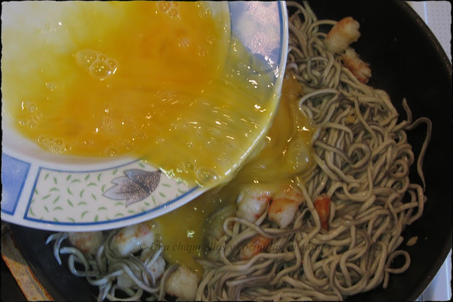 Batir los huevos con una pizca de sal e incorporarlos a las angulas sucedáneas. Remover todo el conjunto hasta cuajar el huevo a la textura deseada.