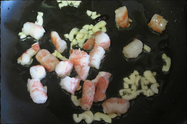 Cuando empiece a dorarse el ajo, añadir los gambones y saltearlos un poco.
