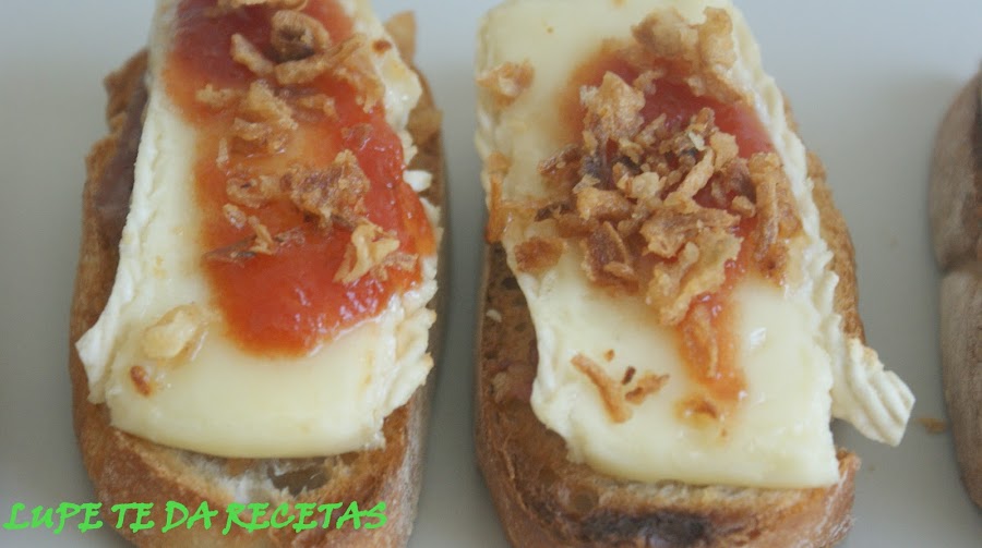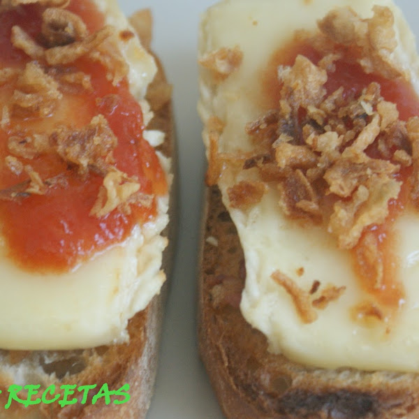 MONTAR: Sobre una rebanada de pan tostado poner un trozo de panceta, cubrir con el queso y meter en el horno a gratinar un par de minutos, poner una cucharada de cebolla frita y por último la mermelada de tomate. Tomar caliente.
