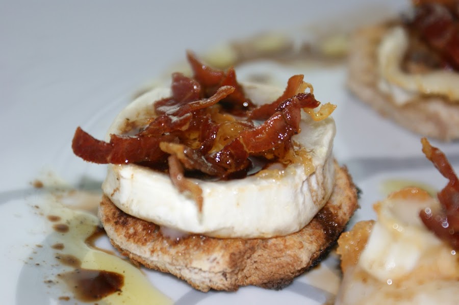 Montar: Poner una rebanada de pan cortada del tamaño del queso, encima colocamos una rueda de queso de cabra en rulo y por último ponemos cebolla caramelizada. Rematamos con un hilo de vinagre de naranja.?