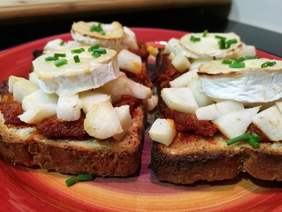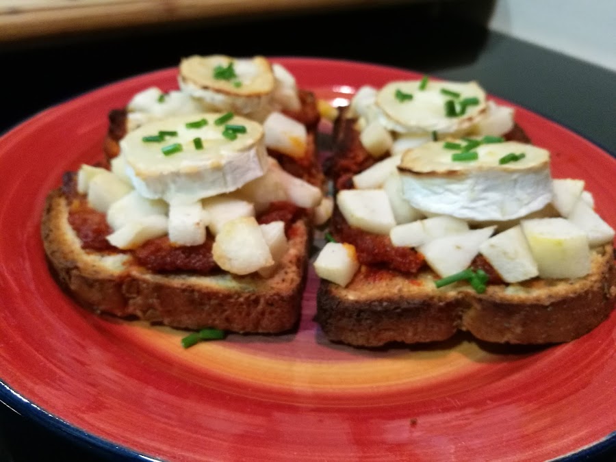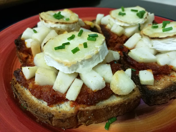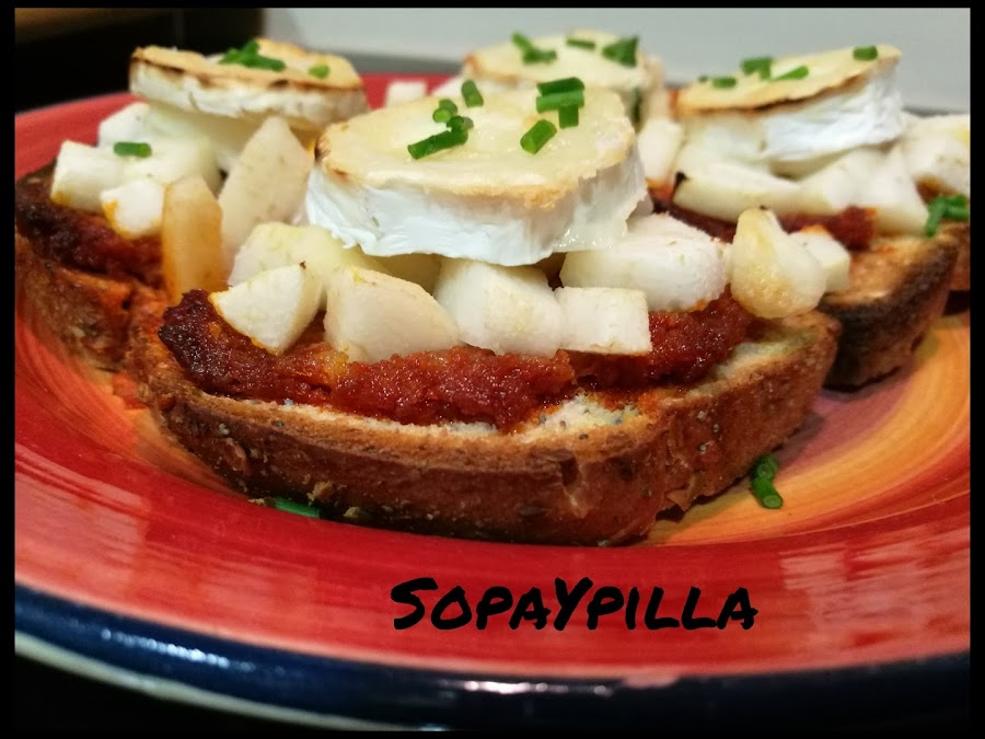 - Escurrir las peras y distribuilas encima de la sobrasada