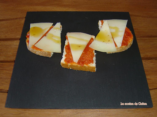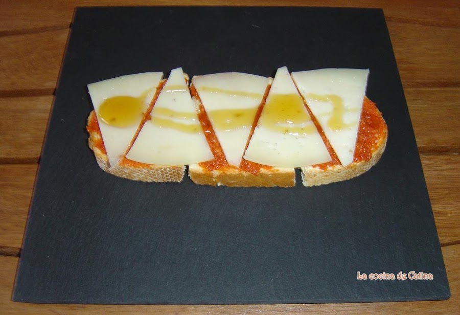 Preparación:Tostamos las rebanadas de pan, las untamos con la sobrasada, cubrimos con el queso laminado en cuñas, y le ponemos un chorrito de miel por encima.