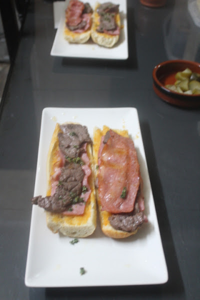 Hoy os traigo unos simples trozos de barra de pan con unos trocitos de filete de ternera y unas lonchas de beicon, aderezados con orégano fresco que quedaron deliciosos.
