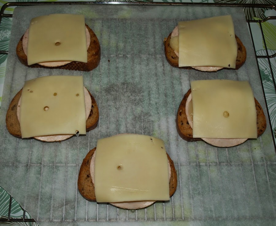 - Por último colocamos una loncha de queso sobre cada tosta, y metemos al horno, en la parte de arriba del todo hasta que se derrita el queso y se dore un poco. Mis lonchas de queso eran de esas de las que no se doran o tardan una eternidad, así que cuando vi que estaban muy fundidas las saqué.