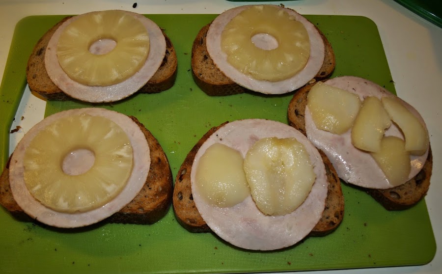 El otro día no tenía ni muchas ganas ni ideas para la cena, y mi chico me propuso unas tostas que comían de vez en cuando en su casa y que estaban muy buenas. Pues buenas no, buenísimas! Unas tostas hawaianas con pavo, piña y queso. Como yo no puedo tomar piña en almíbar, a las mías les puse pera en almíbar sin azúcar. Es que piña solo la encuentro con azúcar, pero pera y melocotón sí los encuentro en versión "sugar free" :)