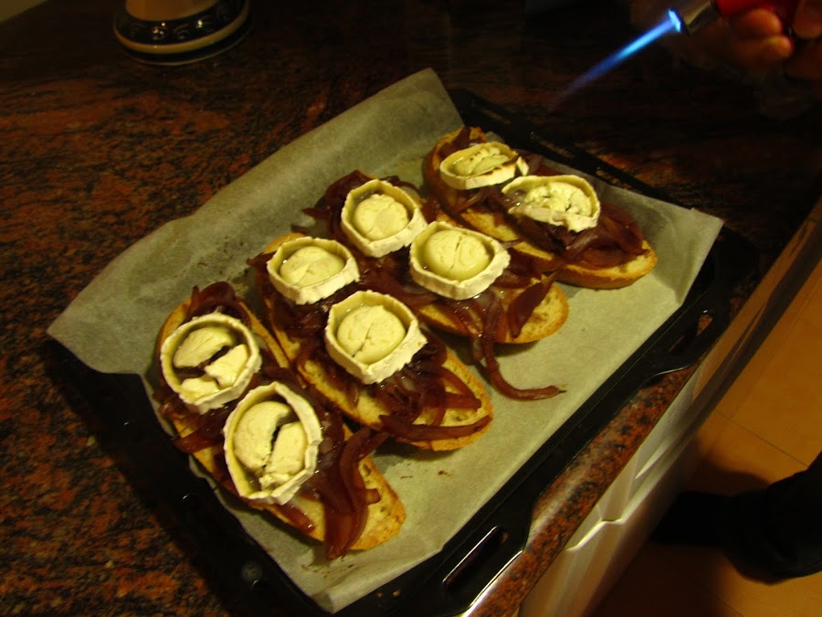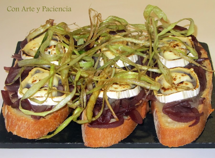 Montamos sobre el pan tostado la cebolla y queso y opcionalmente horneamos ligeramente. Con un soplete quemamos un poco el queso. Agregamos las tiras de puerro.