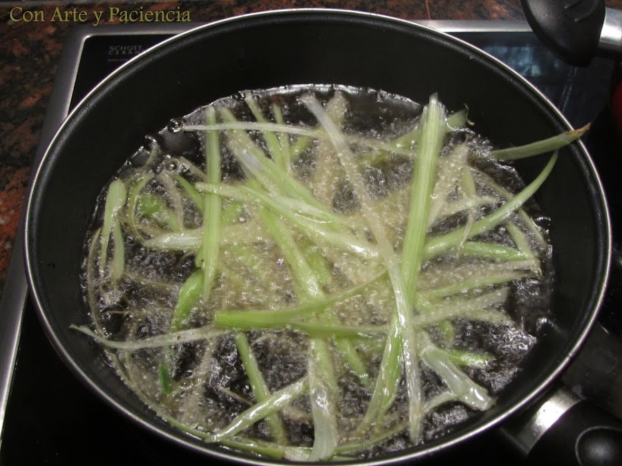 Con un pelador de patatas hacemos tiras el puerro y las freímos un minuto en aceite de oliva a fuego alto. Escurrimos el aceite sobre papel absorbente.
