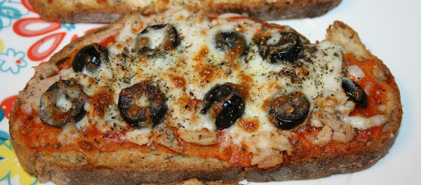 Tostas de atun y aceitunas: Untamos el pan con tomate frito, repartimos el atun y las aceitunas negras, y cubrimos con la mozarella. Espolvoreamos albahaca.