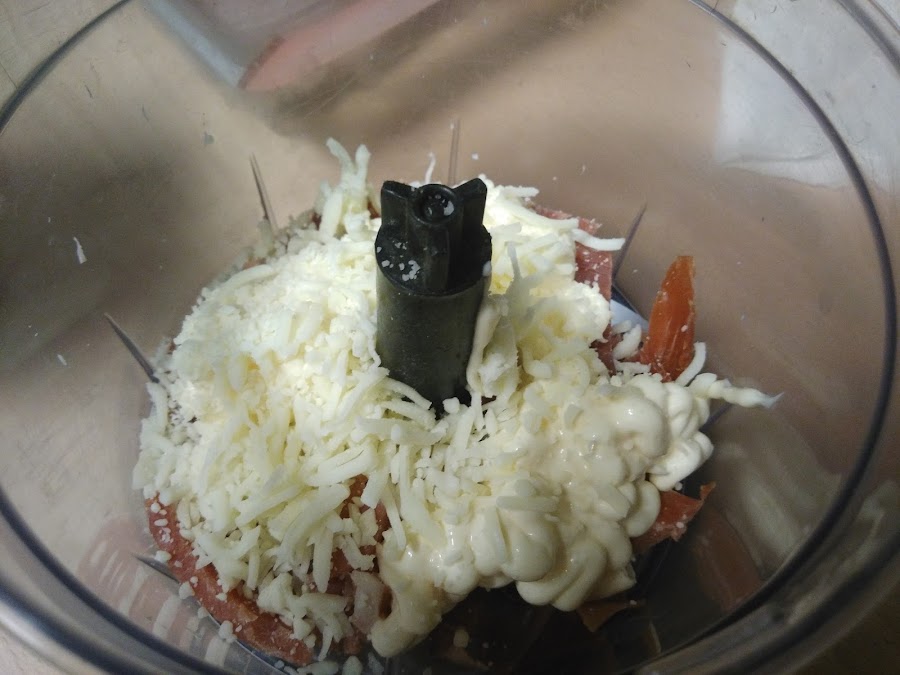 Tostas de jamón y mayonesa: En el accesorio picador de la batidora, colocamos todos los ingredientes a excepción del queso en polvo y picamos hasta conseguir una pasta, sin que el jamón llegue a triturarse del todo, debe quedar con un corte más finito. Untamos la rebanada con este "paté", cubrimos con queso grana padano.