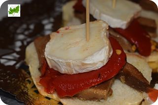 Corta los bollitos o el pan que tengas, en rebanadas. Pon unas tiras de níscalos al ajillo, encima coloca un pimiento del piquillo y corona con una rodaja de queso de cabra