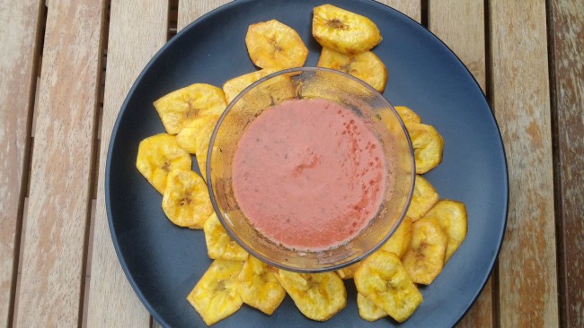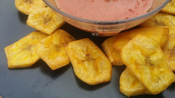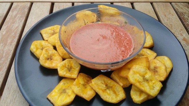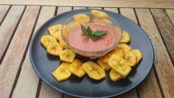 Los tostones generalmente se sirven para acompañar otro plato, pero he seguido la receta propuesta y he agregado un dip para servirlos como aperitivo.
