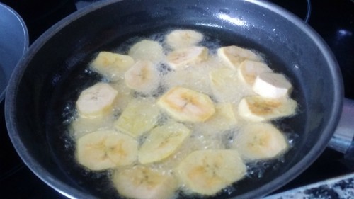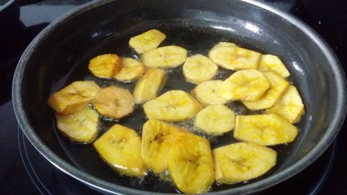 2. En una cacerola calienta el aceite y fríe los plátanos hasta que estén dorados por fuera.