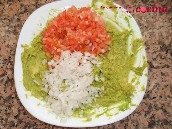 A continuación picamos la cebolla y el tomate muy bien picadito pero siempre a cuchillo. No lo hagáis con picadora porque se os quedará demasiado "líquido" y no es lo que queremos. Queremos que se note tanto el tomate como la cebolla. Cuando lo tengamos listo lo vamos mezclando todo hasta que se integre con el aguacate.