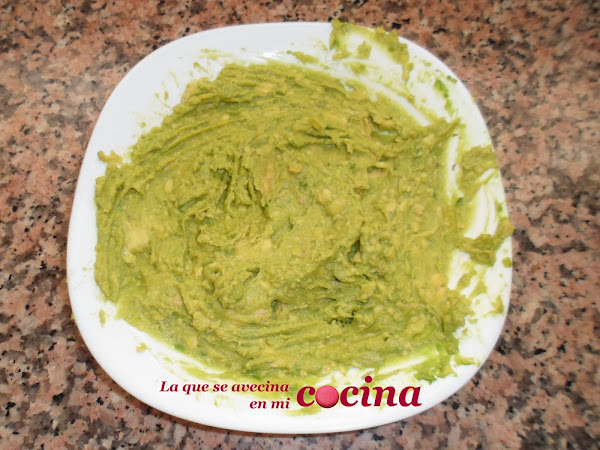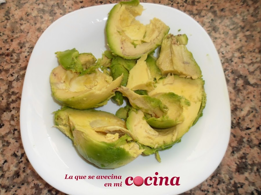 A continuación nos pondremos con el guacamole. Para ello comenzaremos sacando la carne de los aguacates y lo machacamos con un tenedor hasta aplastar los grumos que vayamos encontrando.