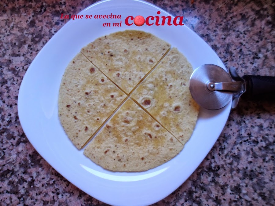 Comenzaremos partiendo las tortillas en 4 trozos con un cortapizza. De esta manera conseguiremos un corte más limpio y rápido. Si quisiéramos conseguir unos totopos más pequeños solamente tendríamos que cortarlos en 8 partes.