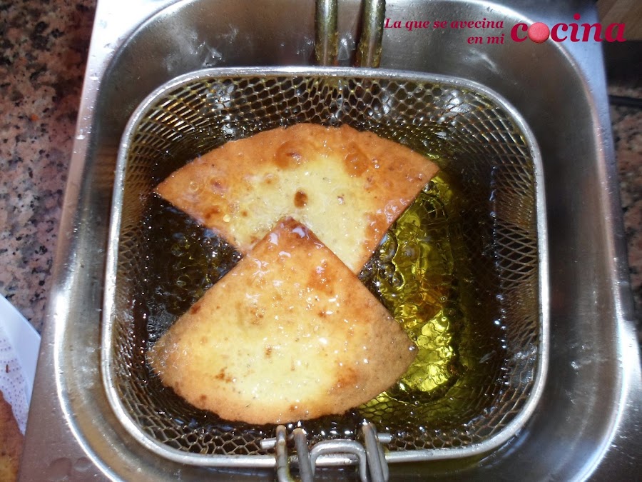 Cuando tengamos los trozos hechos, sólo tendremos que freirlos en abundante aceite de girasol caliente. Yo en mi caso utilicé la freidora y tuve que darle la vuelta puesto que no se freía por los dos lados a la vez. Eso sí, sea como sea no lo dejéis más de 3 minutos, no sea que se nos quemen. Cuando los vayamos haciendo los iremos poniendo en un plato con papel de cocina para que escurra el exceso de aceite y los dejaremos enfriar.