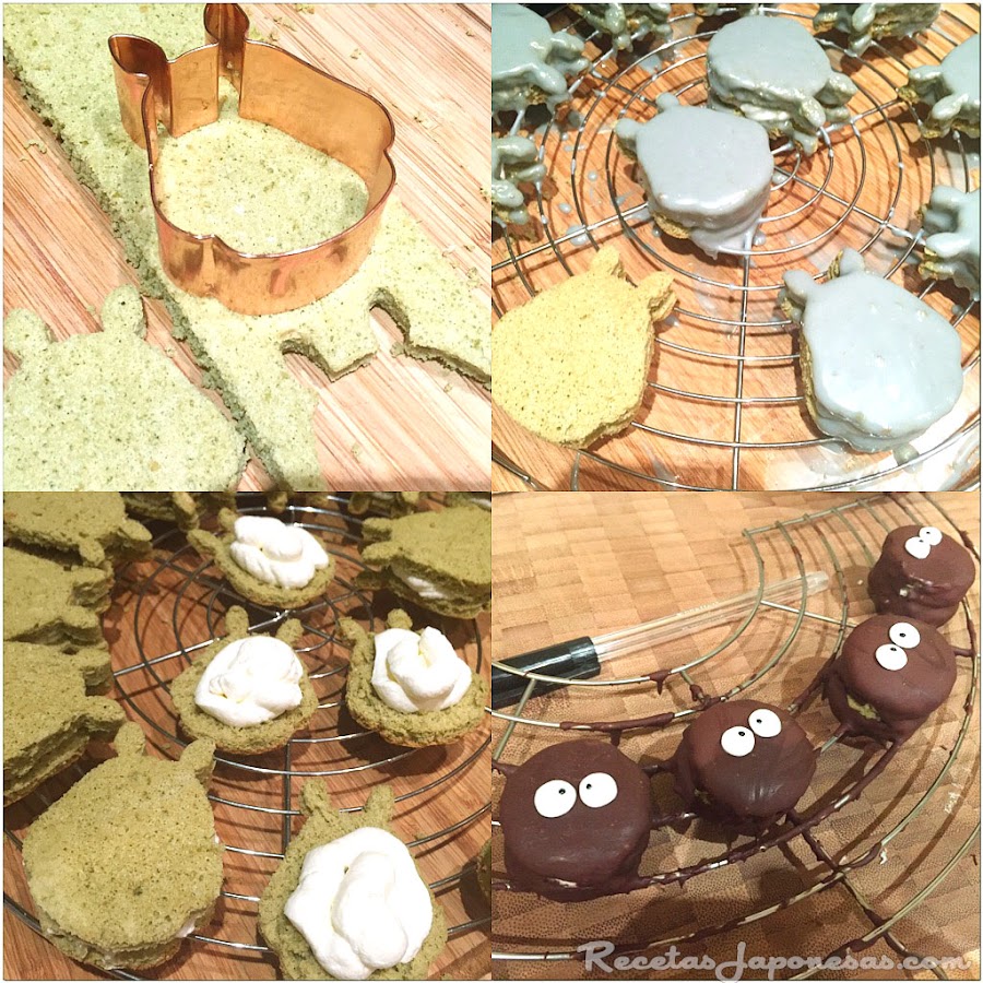 Nota: Esta es una receta bastante difícil y que requerirá precisión y pericia en su realización. Da para unos 10-12 Totoros. Puedes rellenar los Totoros de lo que quieras, chocolate, mermeladas o solo nata (crema de leche), para esta receta he usado una mezcla de nata (crema de leche) con queso mascarpone. Puedes optar por no utilizar el icing para el cuerpo de Totoro y usar cobertura de chocolate blanco. Si quieres hacer los "duendes del polvo" corta el bizcocho con un cortagalletas redondo y cobertura con chocolate negro, para los ojos sigue los mismos pasos que para hacer los de Totoro.