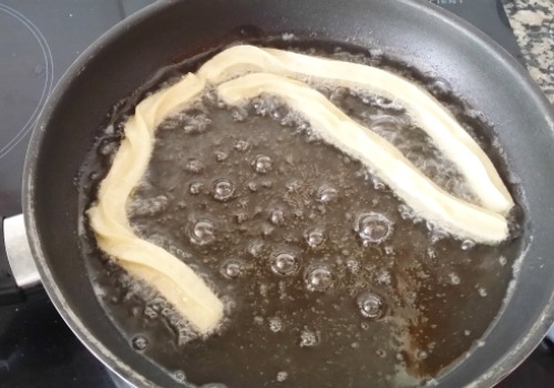 Disponemos en el fuego una sartén amplia y llena de aceite para freír los churros.