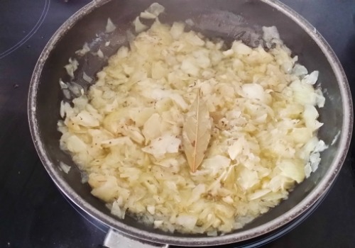 En primer lugar, vamos a preparar la crema de morcilla. Para ello, pochamos la cebolla junto con el ajo, el laurel y el tomillo en una sartén con aceite de oliva.
