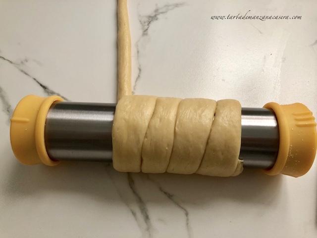 Vamos con la receta, ingredientes a temperatura ambiente. Podéis utilizar levadura fresca o seca de panadero tanto la normal como la instantánea (ver Dulcepedia). La receta que he utilizado es la que más veces he visto en la red y curiosamente la que viene en las instrucciones del molde de Tescoma. Son todos de andar por casa. La receta es sencilla. Importante respetar el tiempo de levado. Conseguir una masa lisa y elástica. Enrollar con cuidado sobre los tubos previamente untados con un poco de aceite o mantequilla. El último trozo a enrollar lo colaremos bajo el anterior para que no se nos suelte durante el horneado. La primera hornada es de entrenamiento, se me descolgó y rompió uno de ellos, visto el error la siguiente quedó mejor. No os excedáis poniendo masa, ni la pongáis demasiado fina.