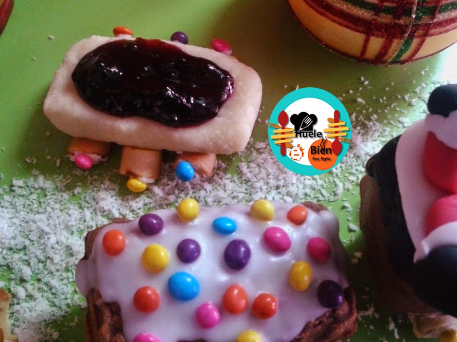 8.- Una vez estén decorados, la locomotora y los vagones. Ponemos los mazapanes sobre las ruedas, sobre esté añadimos una cuchara de mermelada de arándanos. La cubrimos con un vagón de tren.