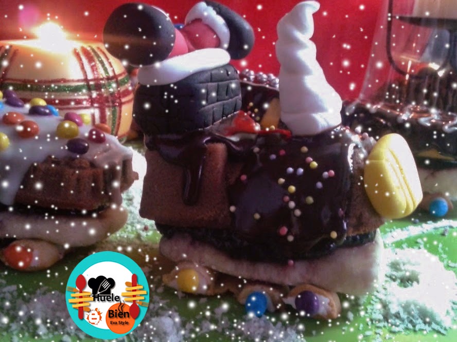 Un tren de 8 vagones decorados con chocolate, pasta fondant y muchos caramelos con sabor a chocolate.