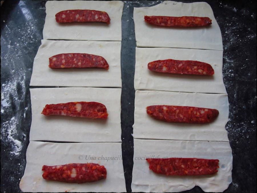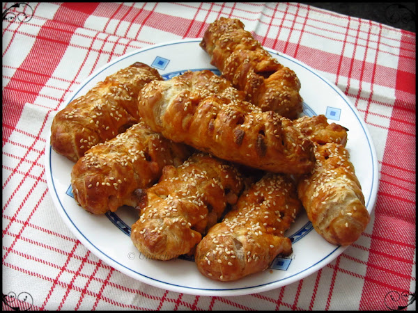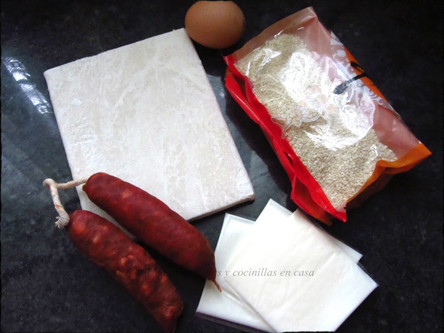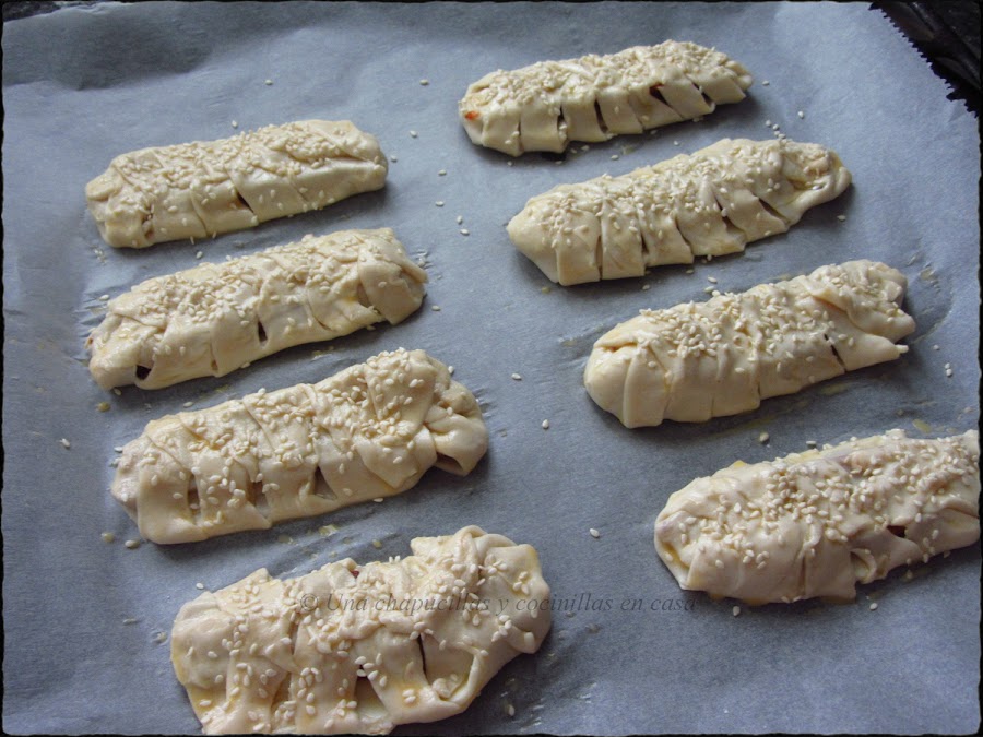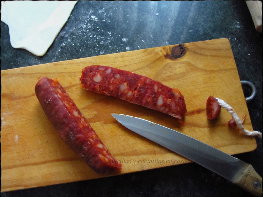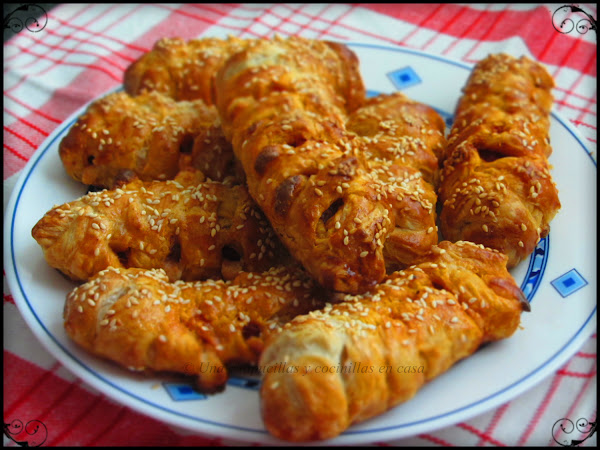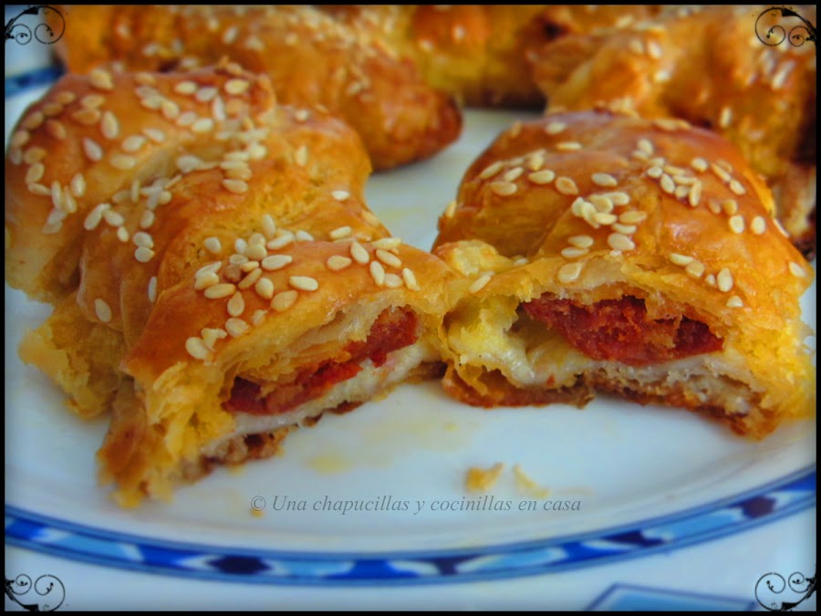 El otro día se me ocurrió darle salida a unos choricitos que me sobraron de hacer talo y pensé, oye ¿y si hago unos hojaldre rellenos con ellos y poco de queso? fueron muy pero que muy fáciles de hacer y se tardan poquísimo en preparar, pues quedaron brutales de ricos, les añadí por encima unas semillas de sésamo y quedaron perfectos :)