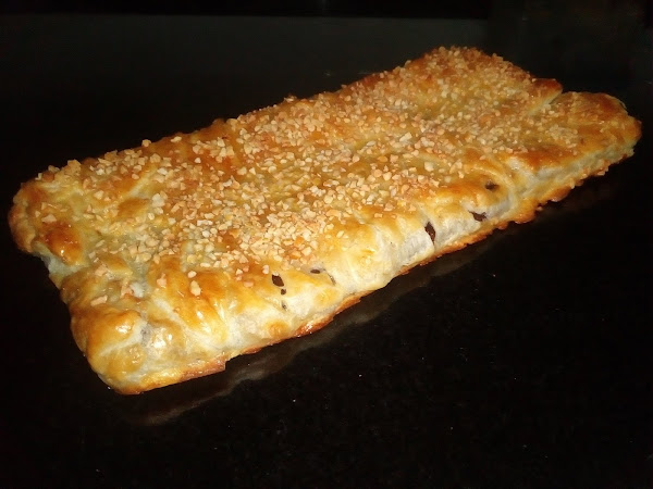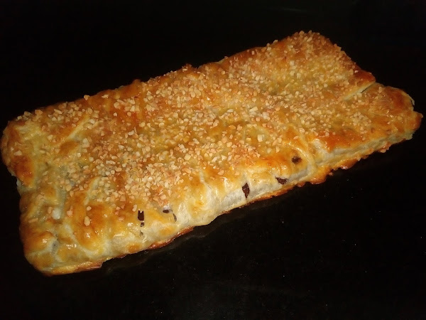 Luego cortamos los laterales en diagonal con un cuchillo afilado y con dos centímetros de grosor entre cada una de las tiras y luego sólo queda ir intercalando cada uno de los cortes para formar nuestra trenza. Si queréis ver cómo debería quedar podéis pasaros por una de mis recetas anteriores: http://lacucharaenlamaleta.blogspot.com/2017/02/trenza-de-hojaldre-de-jamon-y-queso.html