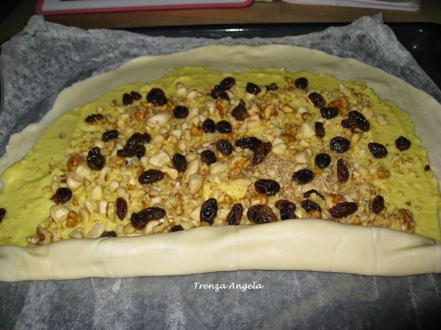 Con un rodillo le damos un poco de forma y untamos encima la crema pastelera, esparcimos la nueces, las almendras y las pasas que previamente habremos tenido macerando en coñac caliente.