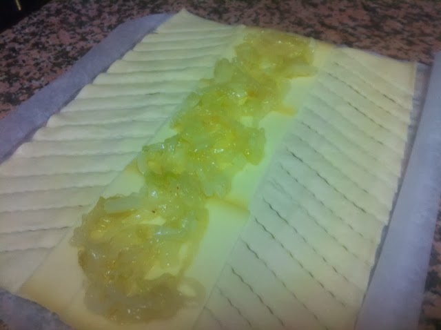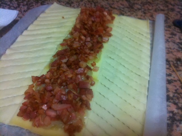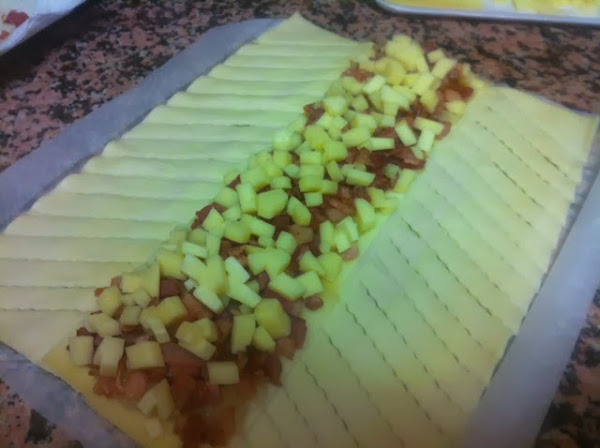 En el rectángulo central que queda sin cortar de la trenza, ponemos las lonchas de queso, encima repartimos la cebolla, el bacon y por último el queso troceado.