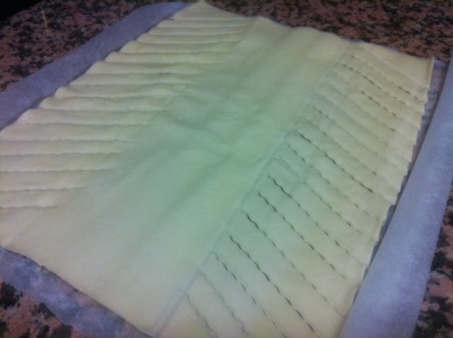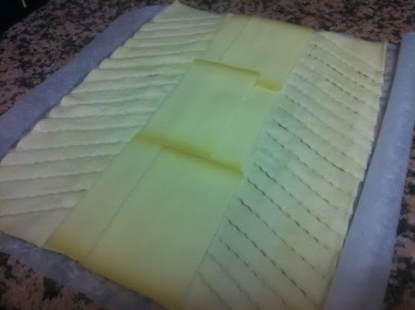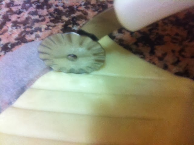 Situar y marcar con cuidado (yo lo hago con un palo de brotxeta) el centro de la trenza como en la imagen y con ayuda de un cortapizzas (o con un cuchillo) cortar tiras de 1 cms aproximadamente.