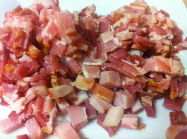 Retirar la cebolla y reservar en un plato y en poner en la sartén sin aceite (o si queréis con una pizca) el bacon a hacerse hasta que se vea doradito y cuando esté listo, retirar a un plato con papel absorbente para quitar el exceso de aceite.