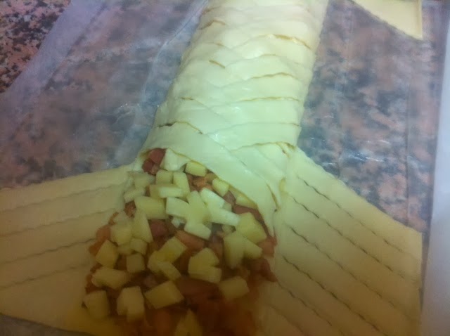 Se trata de una trenza rellena, que se hace bastante rápido y queda muy vistosa después de pasar por el horno.