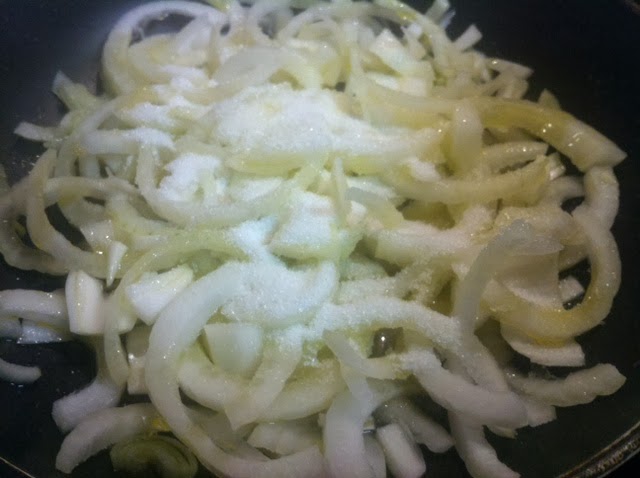 En una sartén ponemos las 2 cucharadas de aceite y cortamos en juliana la cebolla (en tiras finas), junto con la cucharada de azúcar para que vaya caramelizando a fuego medio durante 20-25 minutos.