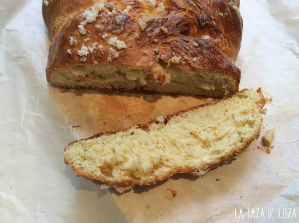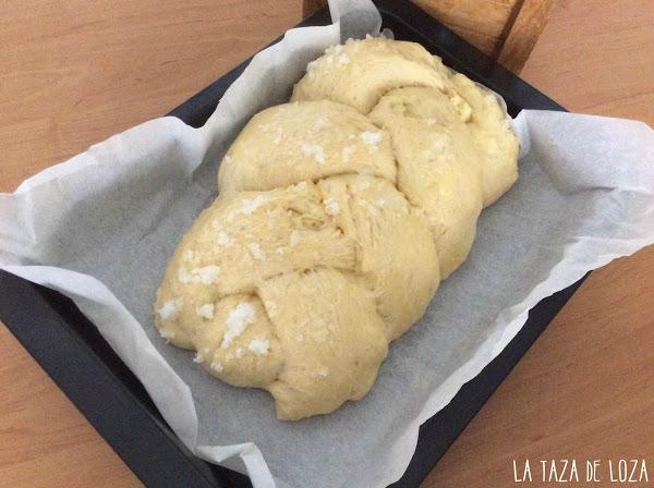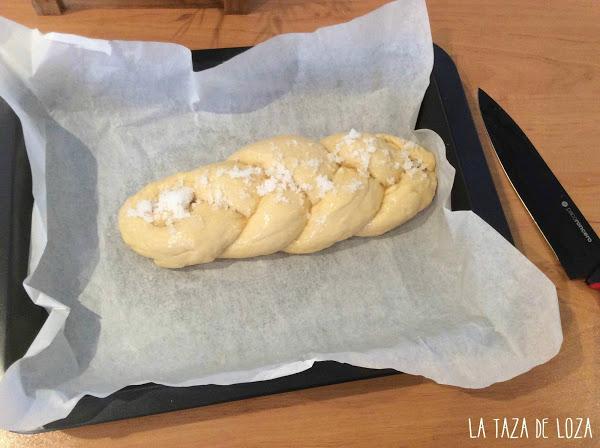 Una vez hecha la trenza, se pinta con huevo y en un plato se ponen una cuchara grande de azúcar y con unas gotas de agua se mezcla con la mano y se coloca este azúcar por encima de la trenza.