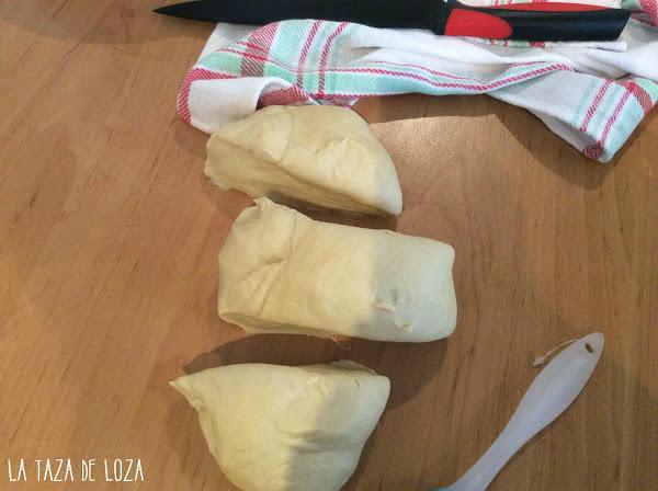 La masa de la Trenza se divide en tres partes para hacer una trenza, después se amasa haciendo 3 largas tiras.