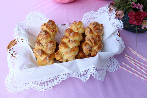 Poner las trenzas en la bandeja del horno, pintarlas con huevo batido y poner por encima azúcar mojado.El azúcar mojado se hace mezclando azúcar con un poquito de agua.