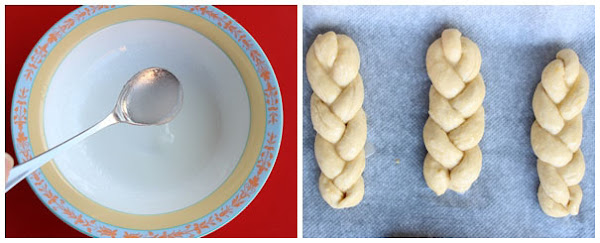 Poner la bandeja con las trenzas en el horno a 50º unos 20 minutos para que suban, luego subir la temperatura del horno a 200º y dejarlo unos 20 minutos o hasta que se vea dorado.