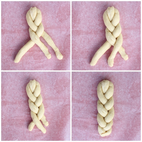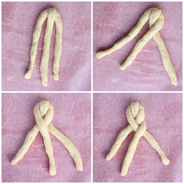 De cada porción hacer dos churros, uno el doble de largo que el otro para poder hacer bien la trenza.