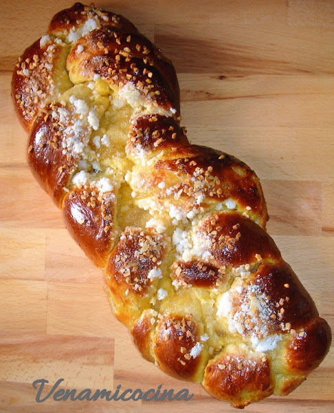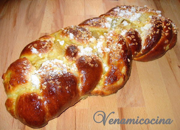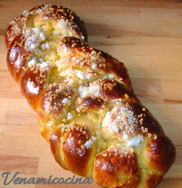 Pinta con huevo batido, espolvorearde las trenzas con azúcar ligeramente húmedo y con las almendras. Hornea a 180ºC en horno precalentado 25-30 minutos.
