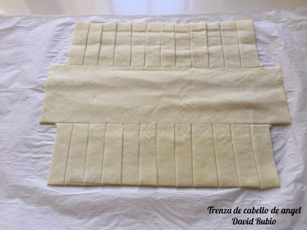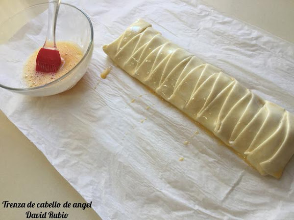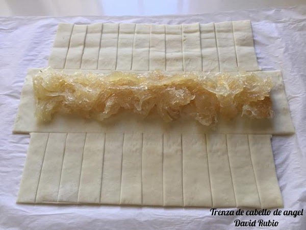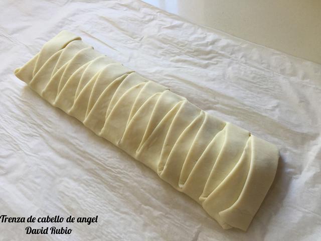 Ponemos con una cuchara el cabello de ángel a nuestro gusto en la parte central del hojaldre, sin llegar hasta el final.