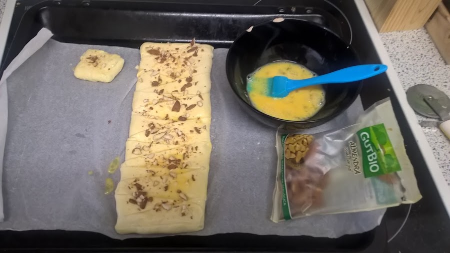Luego batimos un huevo y "pintamos" por encima el hojaldre. Machacamos unas almendras o las compramos ya picadas y las espolvoreamos por encima.