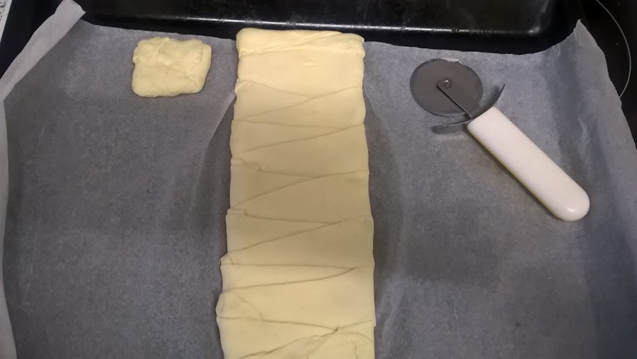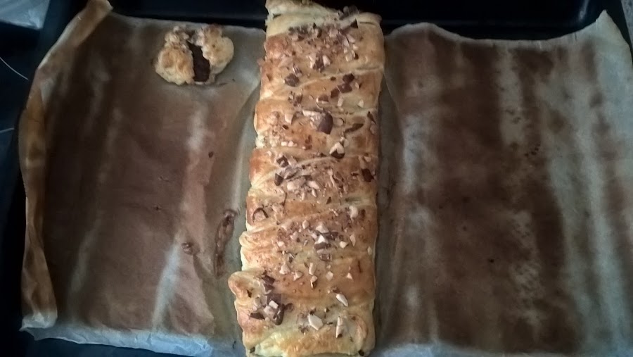 Se despliega el hojaldre y ponemos en medio la tableta de chocolate. Rellenamos el hueco que nos queda con otro trozo de tableta hasta que tengamos de punta a punta atravesando el hojaldre el chocolate. Ver foto: