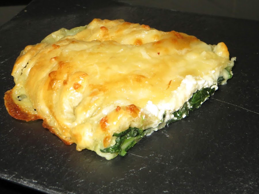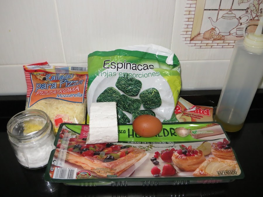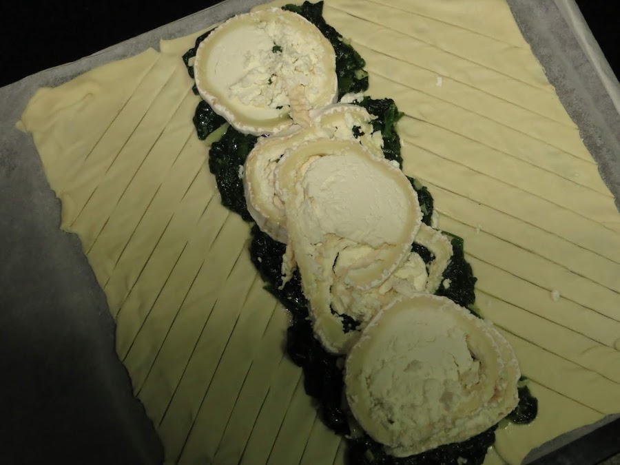 Mientras tanto desenrollamos la masa de hojaldre la dividimos en tres partes y en la zona central colocamos los tranchetes las espinacas y el queso de cabra en rodajas. En los laterales cortamos tiras de la medida de nuestro dedo para hacer nuestra trenza.