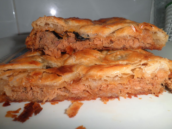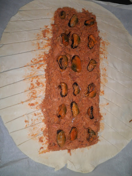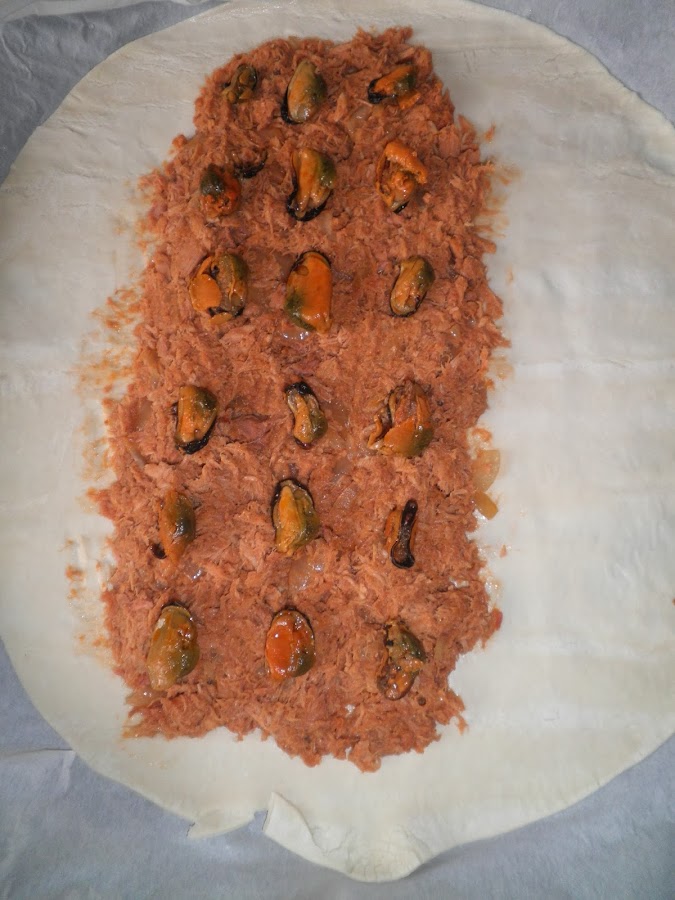 Extendemos el hojaldre, echamos el atún y ponemos los mejillones encima.