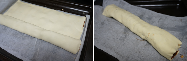 Iremos enrollando la masa hasta formar un rollo con cuidado que no se nos salga el relleno. Pasamos el rollo a la fuente de horno, pondremos una hoja de papel, se puede poner el que lleva el hojaldre. Una vez enrollado cogemos un extremo y lo apretamos para cerrarlo. Con un cuchillo haremos un corte por la mitad del rollo, cortaremos hasta llegar al extremo que está cerrado.