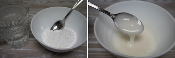 Mientras se enfría preparamos el glaseado. En un bol ponemos el azúcar glas e iremos añadiendo agua poco apoco hasta que nos quede como una crema. Hay que empezar echando 2 cucharadas de agua, luego iremos añadiendo de cucharada en cucharada.