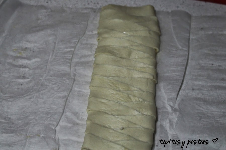 Desenrollamos la plancha de hojaldre y la dividimos, sin cortar, en tres partes, la de en medio un poco más ancha.