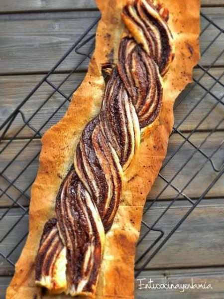 Con un cuchillo sin dientes, cortamos nuestro rollo de hojaldre por la mitad. Vamos trenzando las dos mitades.