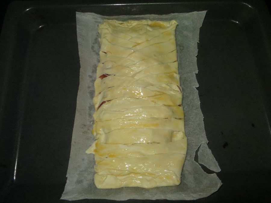 Calentamos el horno a 180º con calor arriba y abajo, pintamos la trenza con huevo batidos y dejamos en el horno durante 20 minutos o hasta que veamos que tiene un color dorado. Sacamos y ya está lista para comer.